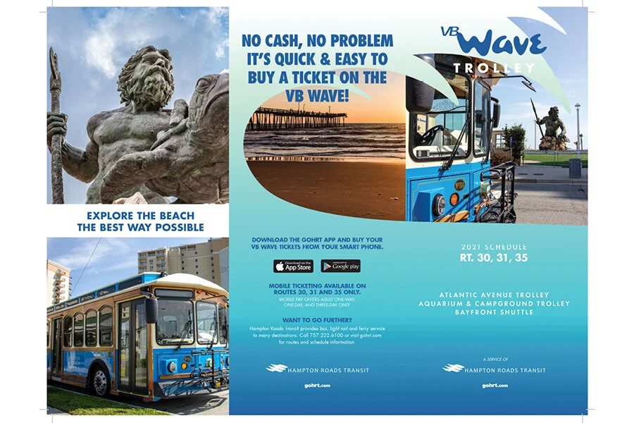 The example used in this process is the VB Wave Trolly Schedule. It is a Tri-fold brochure, the provided image shows the inside flap, back cover and front.