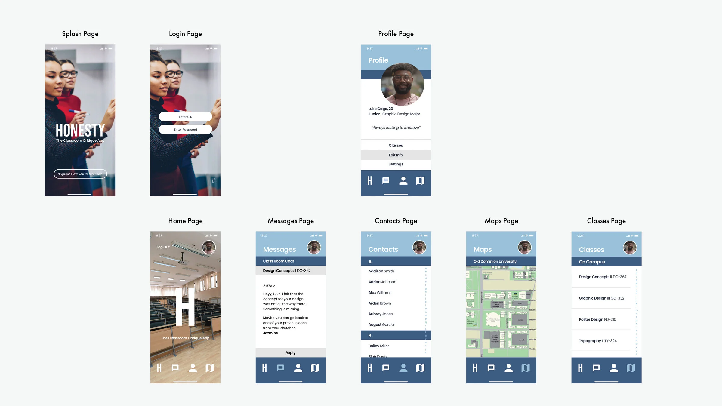 Concept: I believe that the world desperately needs more honesty. The Honesty app, is a mobile application that I envisioned to help promote more honesty and transparency between people during class-room critiques. Students can’t improve if they are not getting real feedback. The app works on a few basic principles, giving you the ability to voice your opinion to your friends directly or to the class based on your location. So far it sounds like, damn near every other app out today right?